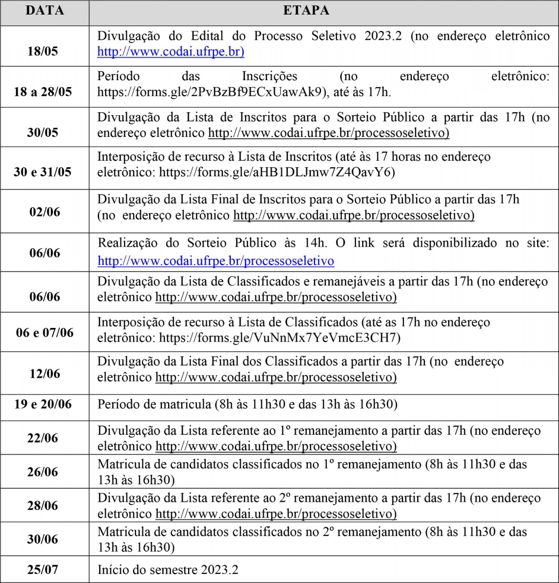Depois de realizado o sorteio, os nomes serão processados no sistema de inscrições e divulgados no site http://www.codai.ufrpe.br/processoseletivo, após às 17h do dia 06/06/2023. Não haverá divulgação do resultado por e-mail ou telefone.