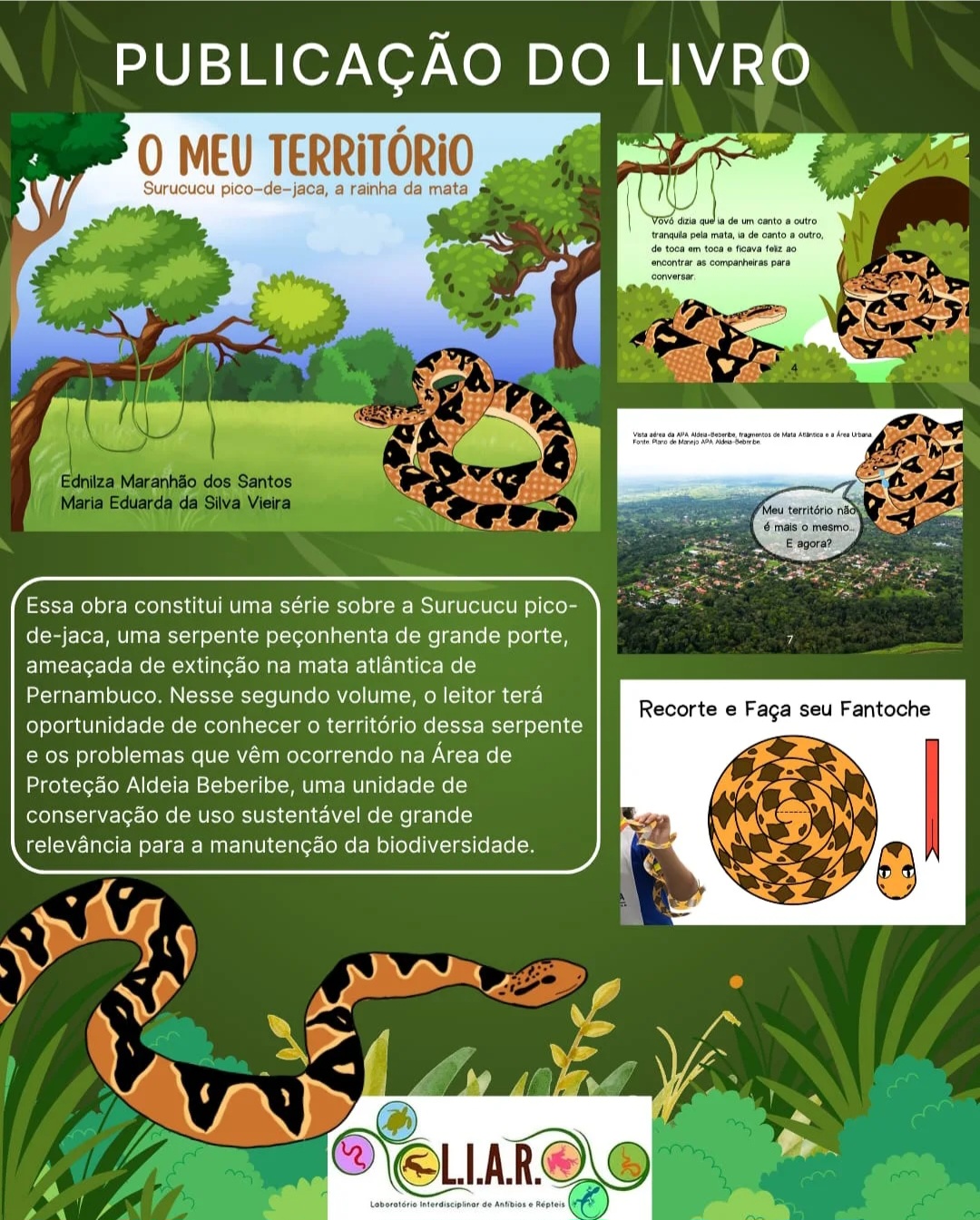 A equipe do Laboratório Interdisciplinar de Anfíbios e Répteis (L.I.A.R) acaba de lançar um novo livro infantil. Intitulado O Meu Território: surucucu pico-de-jaca, a rainha da mata, o livrinho tem como objetivo contribuir com a conservação da espécie e incentivar as crianças a leitura e a contação de uma história do nosso lugar.