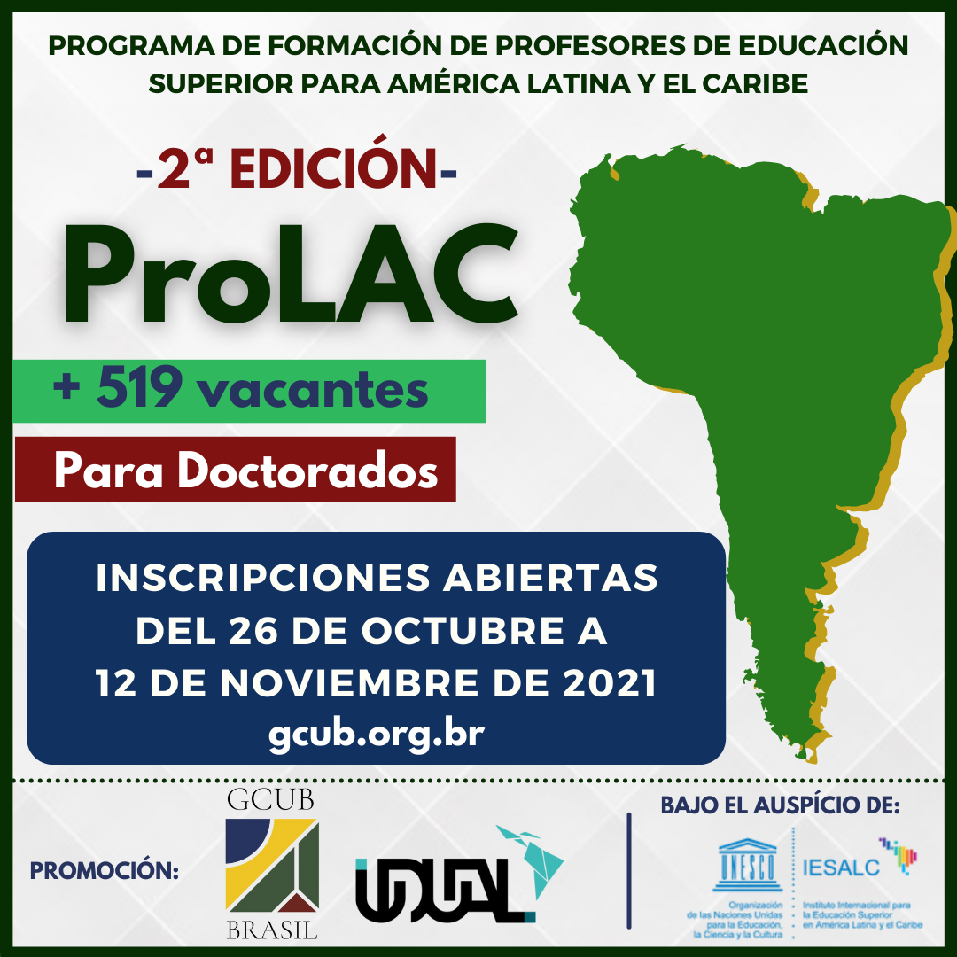Com o prazer de saudá-lo(a), temos o prazer de informar que as inscrições para a 2ª Edição do Programa de Formação de Professores de Educação Superior para a América Latina e o Caribe – ProLAC se encerram no próximo 12 de novembro de 2021. Solicitamos sua especial atenção em dar ampla divulgação ao Programa, junto aos Professores de sua instituição.
