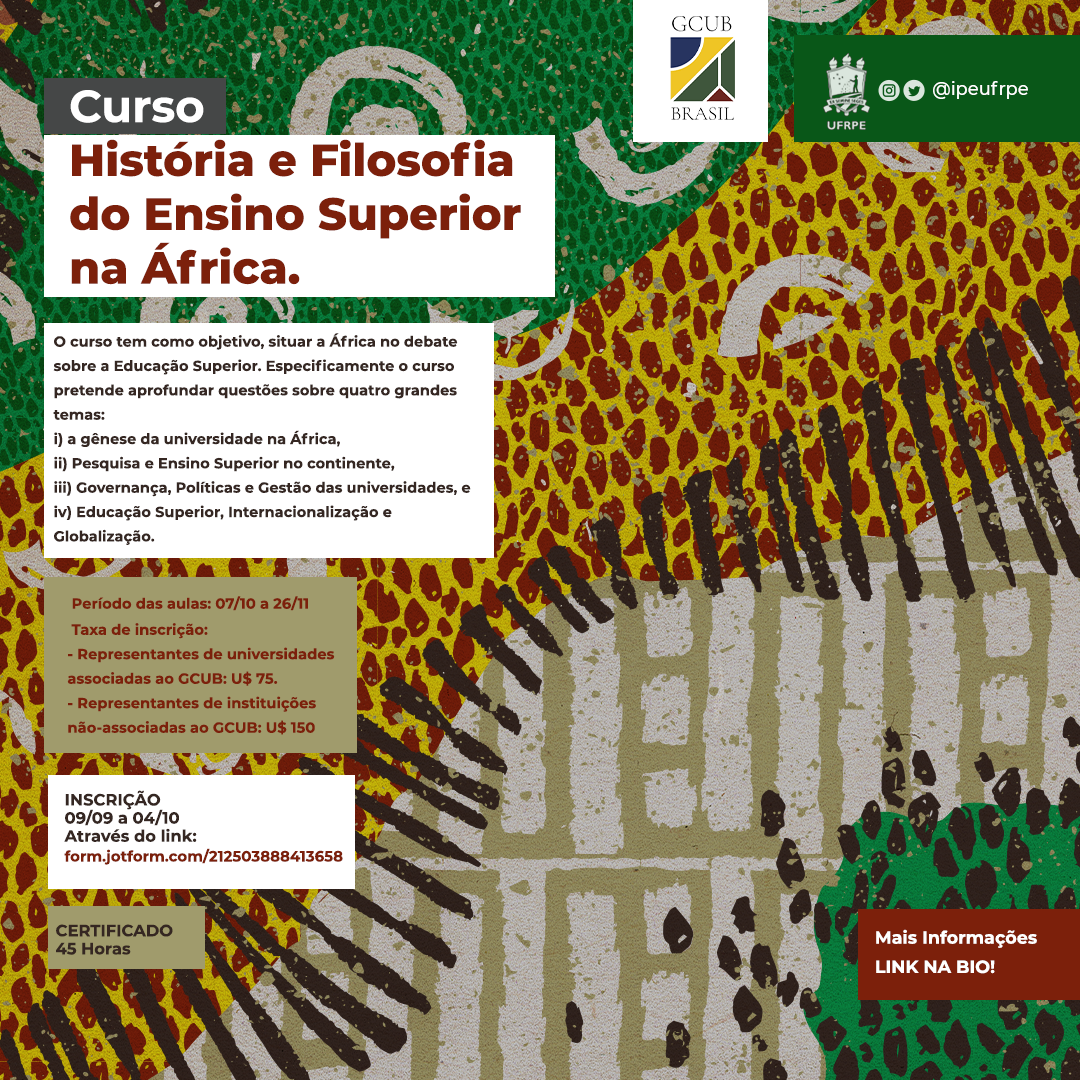 O curso tem como objetivo, situar a África no debate sobre a Educação Superior. Especificamente o curso pretende aprofundar questões sobre quatro grandes temas: i) a gênese da universidade na África, ii) Pesquisa e Ensino Superior no continente, iii) Governança, Políticas e Gestão das universidades, e iv) Educação Superior, Internacionalização e Globalização.