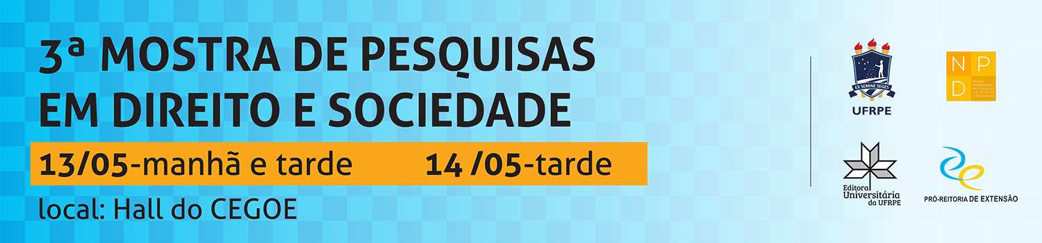 O Núcleo Multidisciplinar de Pesquisa em Direito e Sociedade (NPD/CNPq/UFRPE) realiza, nestas quarta e quinta (13 e 14 de maio), a 3ª Mostra de Pesquisas em Direito e Sociedade. O evento ocorrerá no hall do Centro de Ensino de Graduação (Cegoe), campus Dois Irmãos, nos turnos da manhã e tarde.