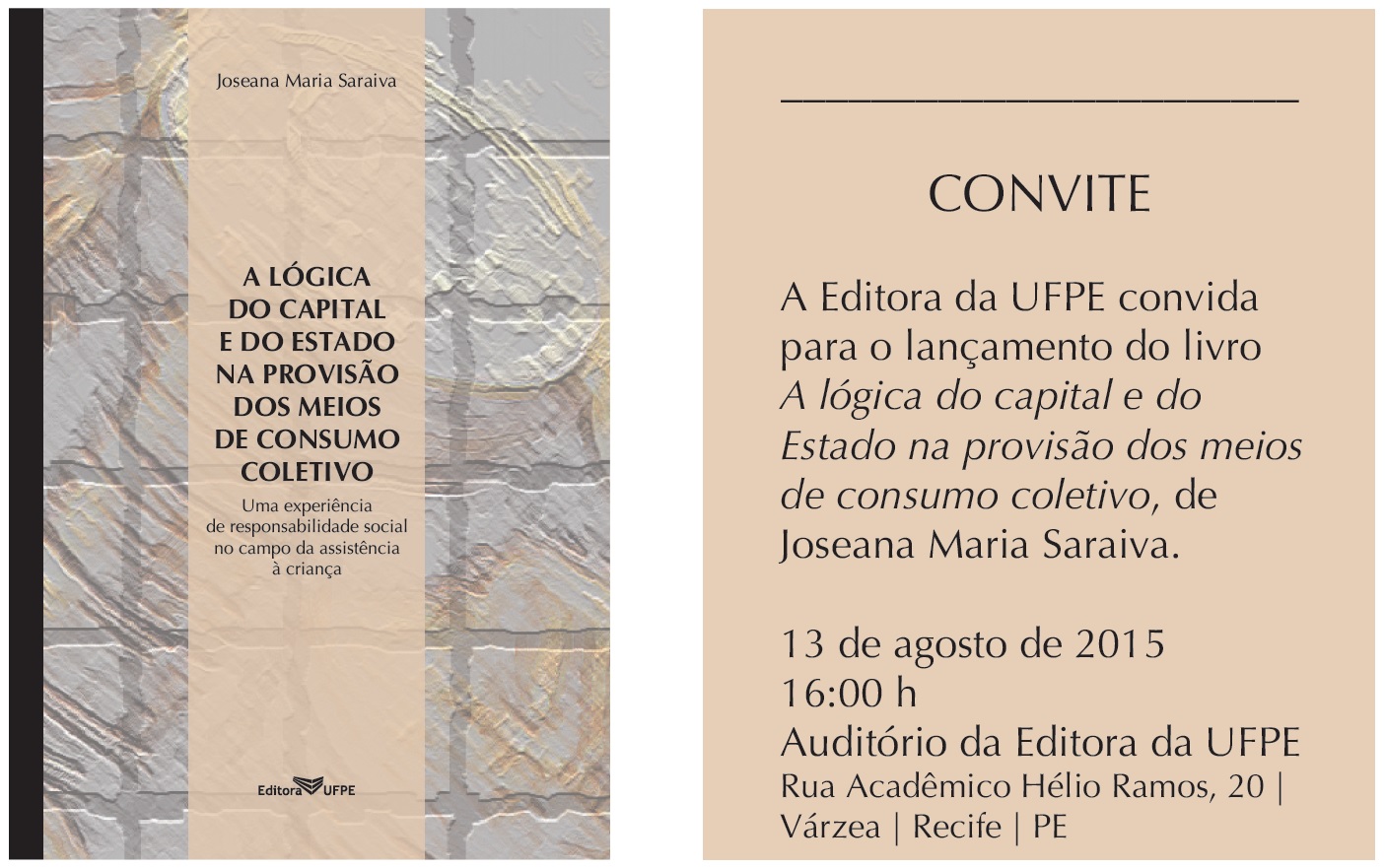 Será realizado na próxima quinta-feira (13/08), às 16h, o lançamento do livro “A lógica do capital e do Estado na provisão dos meios de consumo coletivo”, de autoria da professora Joseana Maria Saraiva, do Departamento de Economia Doméstica da UFRPE. O livro será lançado no Auditório da Editora da Universidade Federal de Pernambuco (UFPE), na Várzea.